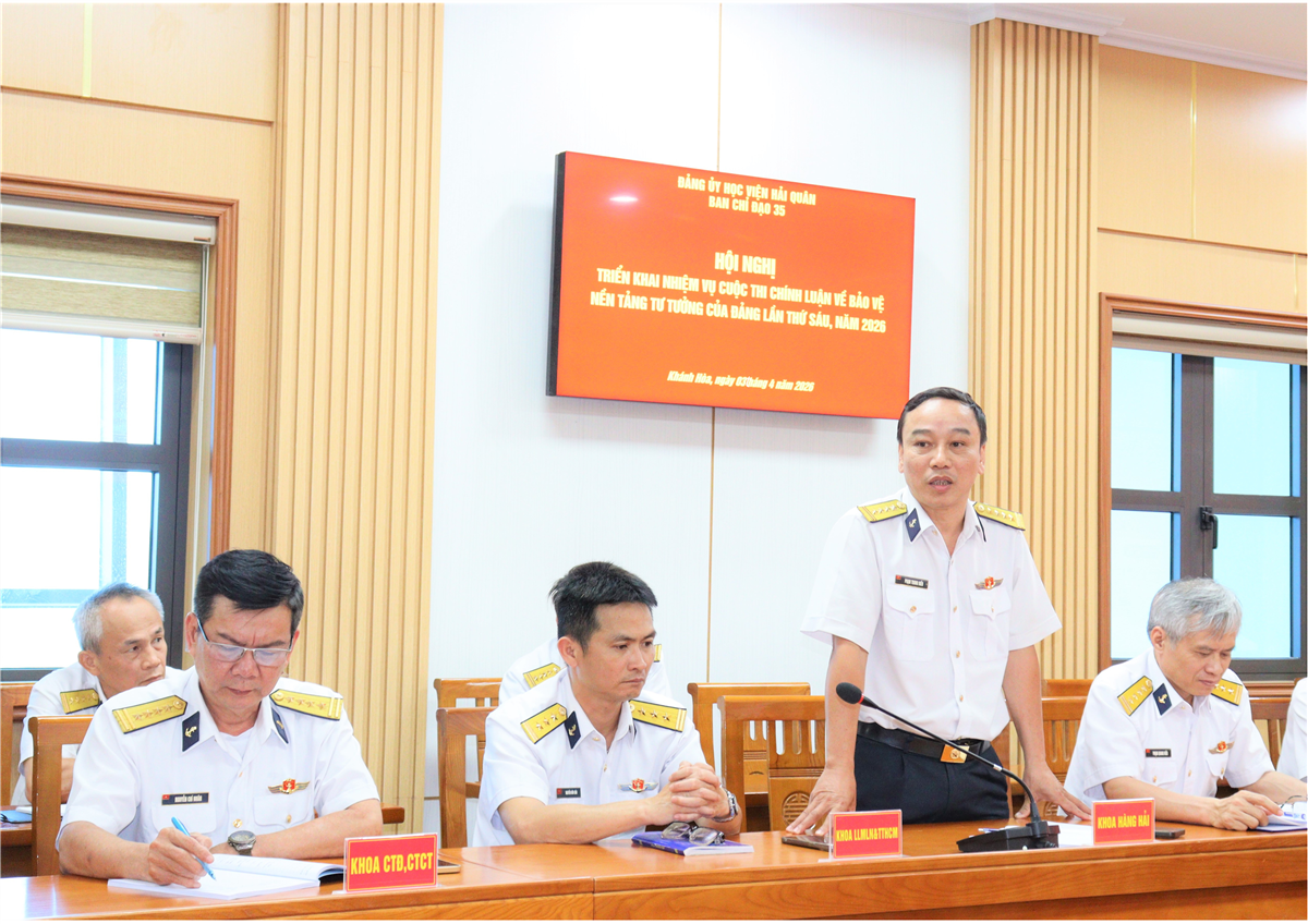 Chiều 3-4, tại tỉnh Khánh Hòa, Ban Chỉ đạo 35 Đảng ủy Học viện Hải quân tổ chức Hội nghị triển khai nhiệm vụ Cuộc thi chính luận về bảo vệ nền tảng tư tưởng của Đảng lần thứ Sáu, năm 2026 trong Học viện Hải quân (Cuộc thi). Đại tá Phạm Đức Hùng, Phó Chính ủy Học viện, Trưởng Ban Tổ chức Cuộc thi chủ trì.