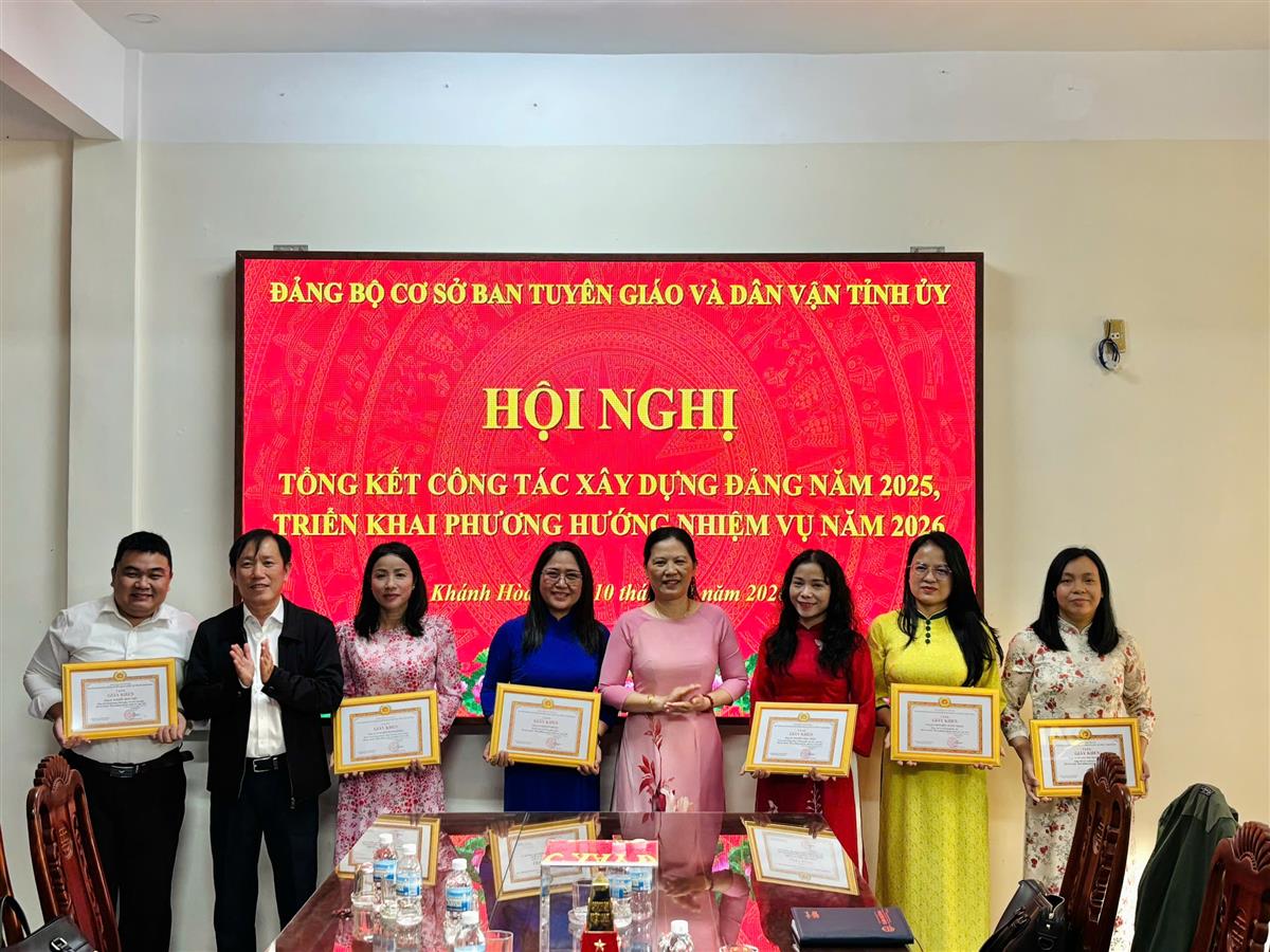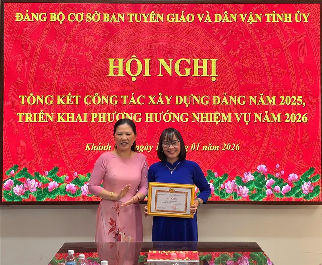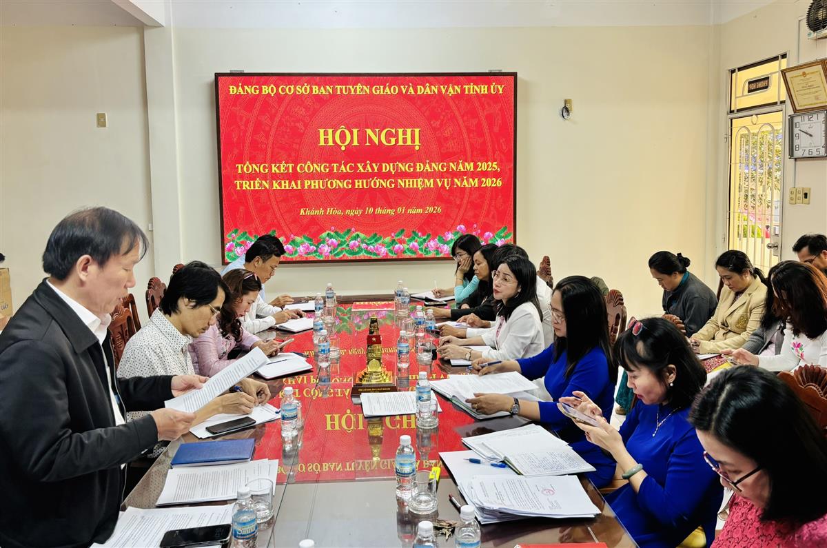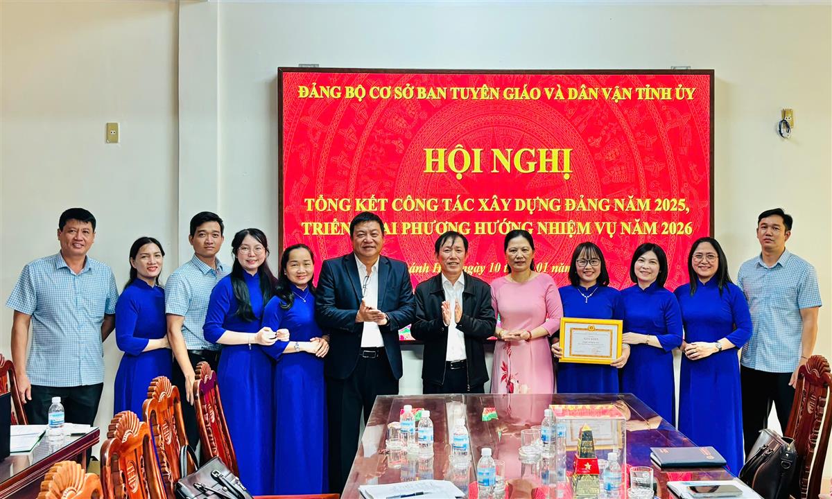 Sáng ngày 10/01, Đảng bộ cơ sở Ban Tuyên giáo và Dân vận Tỉnh ủy tổ chức Hội nghị tổng kết công tác xây dựng Đảng năm 2025, triển khai phương hướng nhiệm vụ năm 2026. Đồng chí Lê Vinh Liên Trang - Bí thư Đảng bộ, Phó Trưởng ban Tuyên giáo và Dân vận Tỉnh ủy chủ trì Hội nghị. Tham dự có đồng chí Võ Hoàn Hải - Ủy viên Ban Thường vụ Tỉnh ủy, Trưởng ban Tuyên giáo và Dân vận Tỉnh ủy; các đồng chí trong Ban Chấp hành Đảng bộ cùng toàn thể đảng viên Đảng bộ.